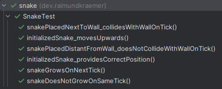 We don’t want the snake to grow immediately when it ate the food, but only on the next tick, so that the last segment “stays” at the same position as the rest of the snake moves a step forward. We can specify this as a unit test like this. Note that I renamed grow() to growOnNextTick() to be more explicit.