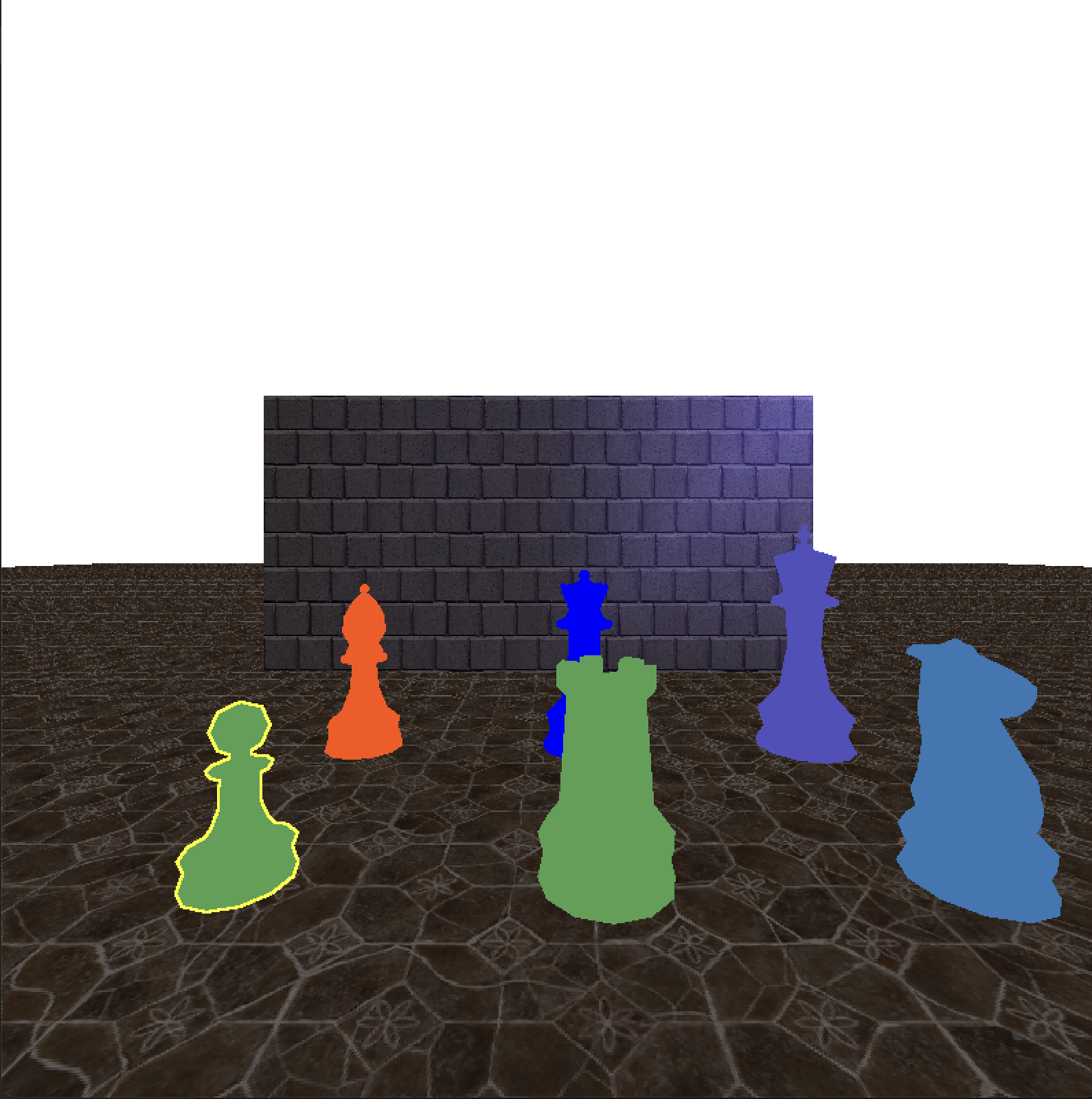 A limitation that you can see in this picture is that the front/bottom edge, where an object touches the floor, is not outlined. This is because the difference between the depth values is basically 0; they literally touch the floor, after all. One way we could fix that is to render the objects that we want to outline to a separate texture, like a z-buffer specifically for one or multiple objects. That way we would also have more control over which objects we want to outline, and we could even use it to outline objects behind walls where the standard z-buffer wouldn’t have any information about them since it contains the closest depth at that pixel. Modern games often render (parts of) the scene multiple times per frame, with different subsets of objects or materials and rendering different properties (colors, depth, lighting information, etc.), but at the cost of additional complexity and computation resources.