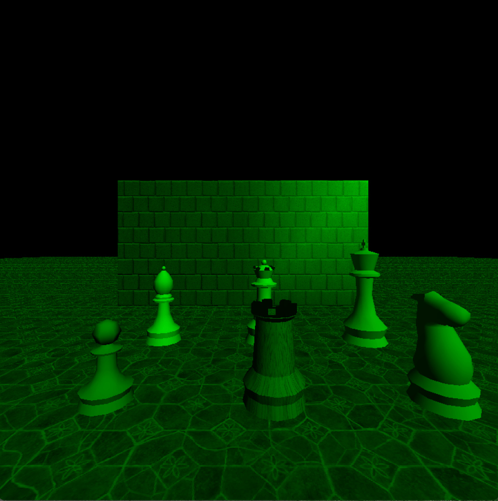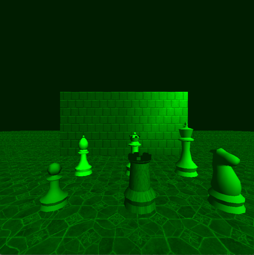 First we want the image to appear green, similar to how we created a grayscale shader earlier. We basically multiply each grayscale value by the color green. As mentioned earlier, there are many ways a color can be converted to grayscale. This time, let’s simply use the maximum value of the three color channels, i.e., max(R, G, B). This is an alternative to using the average, with slightly different results. Since my engine stores colors as unsigned integers, with each channel represented by an unsigned byte, we need to normalize it before multiplying the color green by the brightness per pixel. Here is the result where everything appears green: